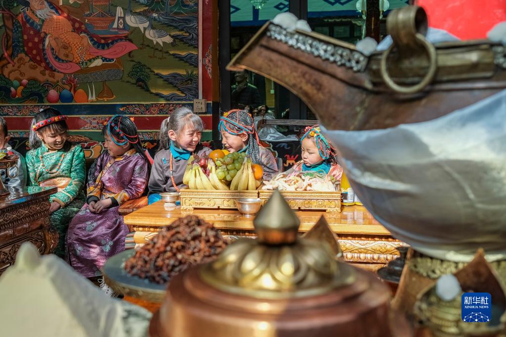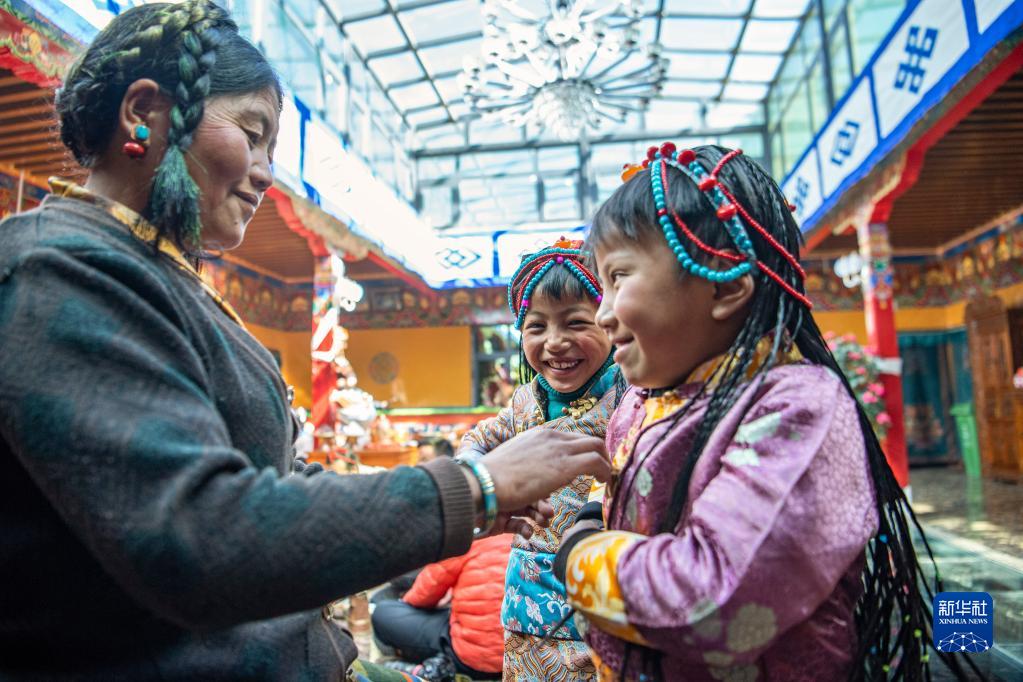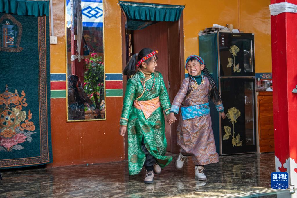 今年,日喀則藏歷農家年和春節(jié)“巧遇”同一天,雖習俗不同,但年味皆濃。次旦的兒孫早早開車去縣城采買了年貨,兒媳婦們在家準備過年吃的羊頭、切瑪?shù)葌鹘y(tǒng)特色美食。家中的第四代,次旦老人的重孫子和重孫女們,則穿上了漂亮的藏裝,頭戴綠松石點綴的頭飾,在家中歡快地跑來跑去。