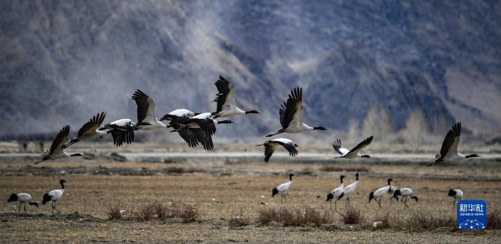 在西藏雅魯藏布江中游河谷黑頸鶴國家級自然保護區日喀則片區拉孜縣附近,大量越冬的黑頸鶴翩翩起舞,迎接春天的到來。