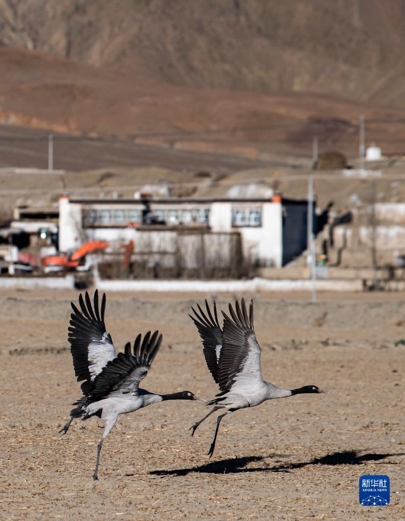 在西藏雅魯藏布江中游河谷拉孜縣農區越冬的黑頸鶴(1月23日攝)。新華社記者 孫非 攝