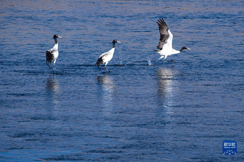 在西藏雅魯藏布江中游河谷黑頸鶴國家級自然保護區日喀則市拉孜縣越冬的黑頸鶴(1月23日攝)。新華社記者 孫非 攝