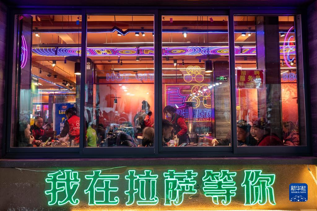 夜幕降臨,拉薩西郊的天海夜市亮起華燈,食客們陸續進入燒烤區內,各家店鋪如往常一樣在烤架上擺好肉串,飄香的煙霧讓晚間的夜市光影朦朧。