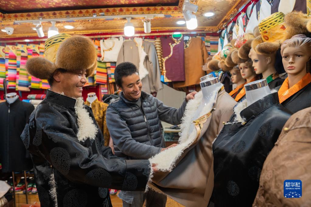 40歲的加拉是一家藏裝店的老板,14歲時就在江孜學習制作手工藏裝。隨著春節到來,買藏裝的人越來越多。加拉整理著精致的手工藏裝說:“好的手工的羊絨藏衣能賣到4000多元,大家都會提前買好新衣,在過年時穿。”