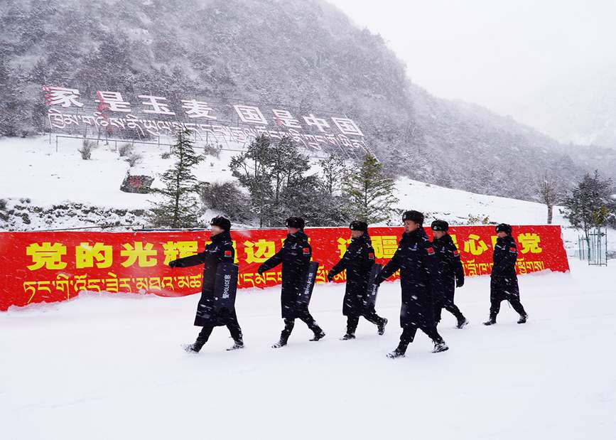 圖為玉麥邊境派出所移民管理警察在大雪中執行巡邏任務。蔣兵攝