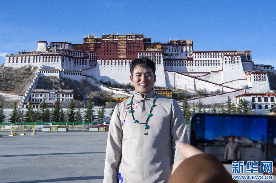一名游客在布達拉宮廣場拍照留念(1月30日攝)。新華網 旦增努布 攝