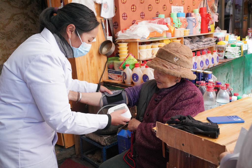醫生為拉薩市八廓街道居民次仁卓瑪(右)測量血壓。新華社記者黃耀漫 攝