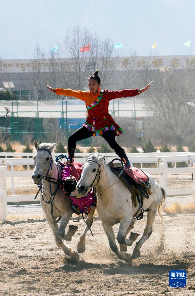 2月23日,騎手進行單人雙馬表演。新華社發(丁增尼達 攝)