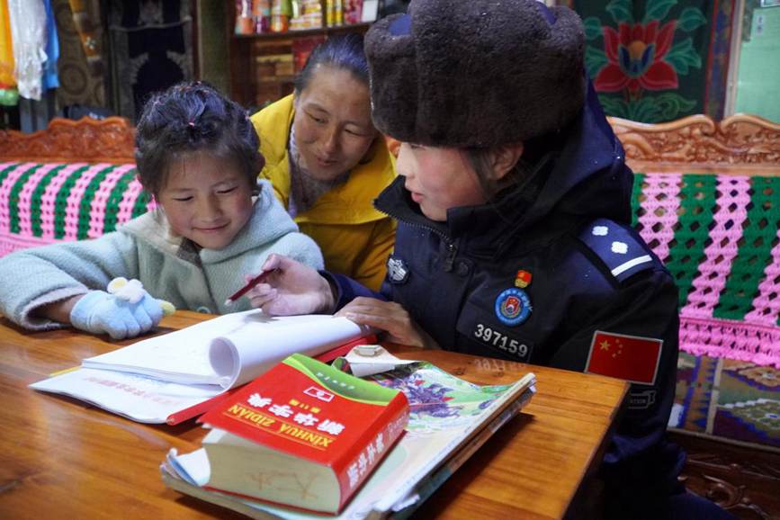 為孩子輔導作業。圖片由玉麥鄉邊境派出所提供