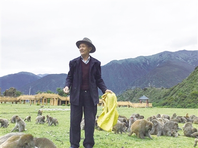 在多布杰看來(lái),猴群也是一個(gè)小社會(huì),母子情深、朋友互助、爭(zhēng)斗打架都有。在上千只猴子中,多布杰只給一只臉特別紅的小猴子取了個(gè)名字——“瑪惹”,漢語(yǔ)意思是“小紅”。因?yàn)槌錾蠛飲寢寷](méi)有奶水,它餓得嗷嗷直叫,多布杰只得將它帶回家中照料。那時(shí),他的孫女也特別喜歡這只小猴子,每天放學(xué)回家就會(huì)給它喂吃的。幾天后,孫女翻遍了每個(gè)角落都沒(méi)有找到“瑪惹”,急得嚎啕大哭。多布杰耐心地說(shuō),我們和“瑪惹”是好朋友,帶它回來(lái)是為了讓它活下去,但它終歸是要回到猴群中,回到猴媽媽身邊。“瑪惹”長(zhǎng)大后,也時(shí)常會(huì)找多布杰蹭衣撒嬌。