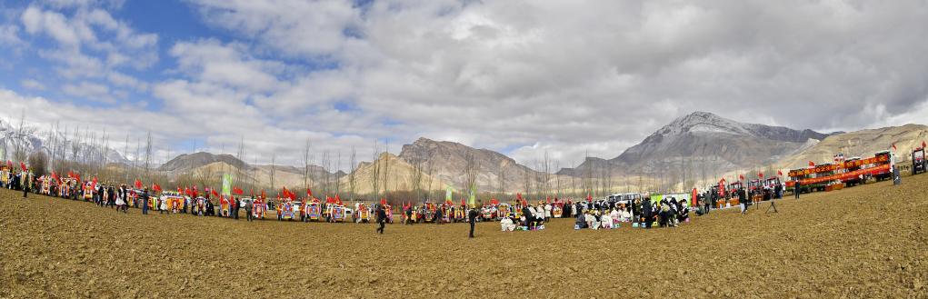 當天是藏歷正月二十四日,據藏族天文歷算,是西藏農區開耕的日子。上午9時許,強嘎村村民身著盛裝,帶著青稞酒、酥油茶等物品聚在田間,共同舉行開耕儀式。