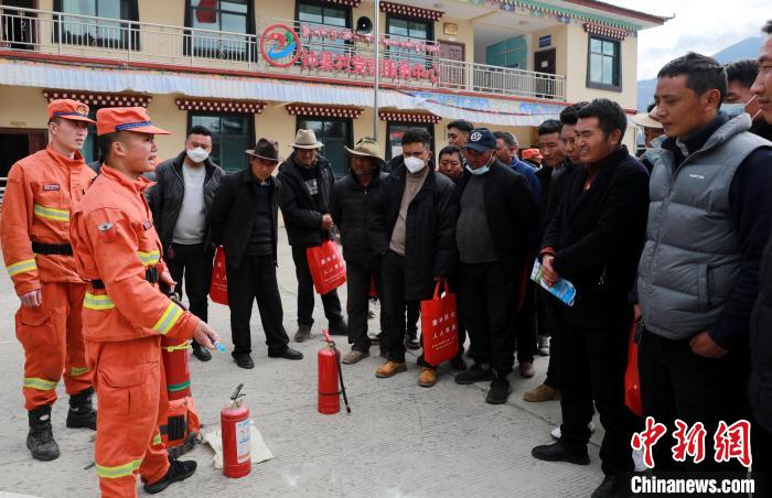 林芝市森林消防支隊(duì)指戰(zhàn)員正在講解滅火器的使用方法。西繞拉翁 攝