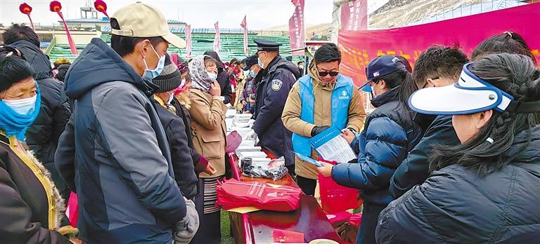 山南市錯那縣“鑄牢中華民族共同體意識 慶祝西藏百萬農奴解放紀念日”活動現場,各宣傳點給群眾發放宣傳資料。記者 旦增蘭澤 攝
