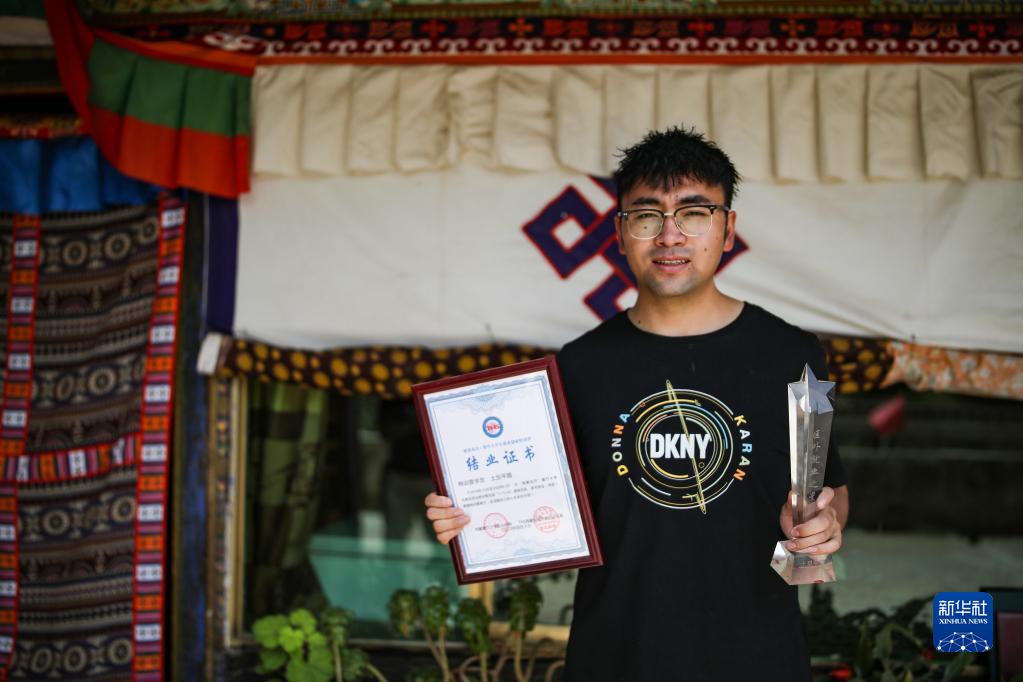 “格桑花開”大學生就業創業特訓營學員、江蘇今世緣酒業股份有限公司甘青藏大區業務經理土旦平措展示特訓營結業證書和“區外就業之星”獎杯(2022年6月23日攝)。新華社記者 姜帆 攝