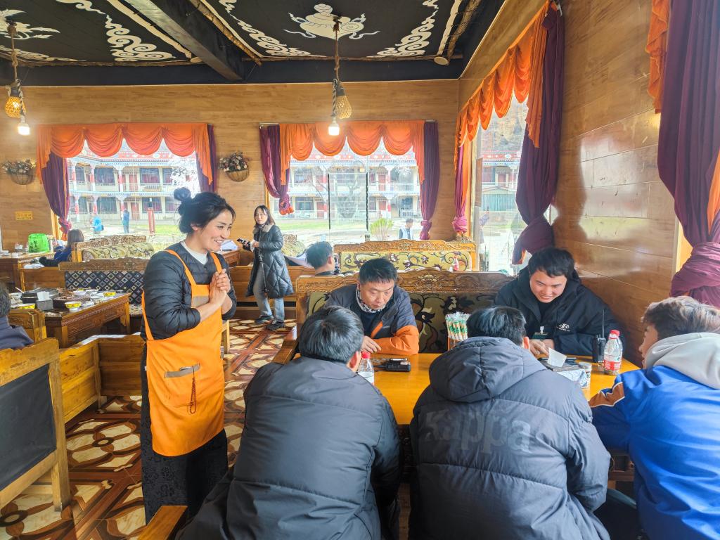德吉旺姆(左一)正在農(nóng)莊招待前來(lái)就餐的游客(3月26日攝)。新華社記者王澤昊 攝
