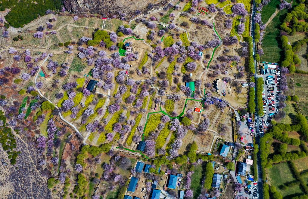 鳥瞰桃花盛開的嘎拉村(無人機照片,3月24日攝)。新華社記者 姜帆 攝