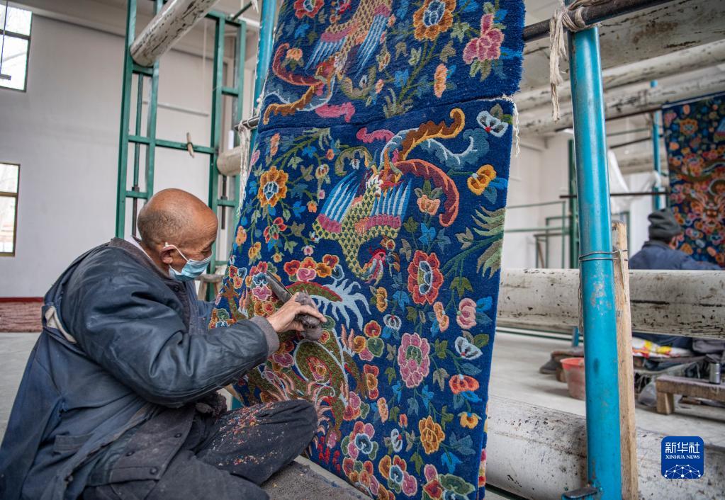 普瓊16歲開始接觸藏毯織造。他說,編織好的毯子需要經過“剪花”,讓圖案更加立體和鮮艷。由于圖案細密、復雜,他面前的這張毯子需要5天左右才能剪出來。