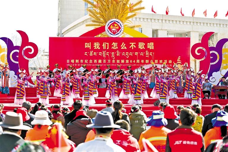 圖為為日喀則市紀念西藏百萬農奴解放64周年群眾聯歡活動現場。