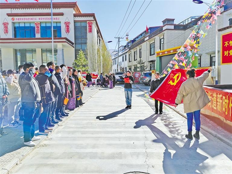 圖為桑珠孜區城東街道黨工委組織干部職工重溫入黨誓詞。