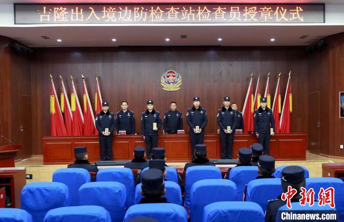 3月31日,邊檢站領(lǐng)導通過授章考核的移民管理警察授章。 肖富貴 攝
