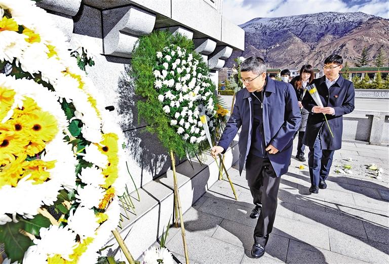 4月2日上午,西藏高爭民爆股份有限公司員工向革命烈士紀念碑敬獻鮮花,表達對先烈們的緬懷之情。何琪 記者 唐斌 攝