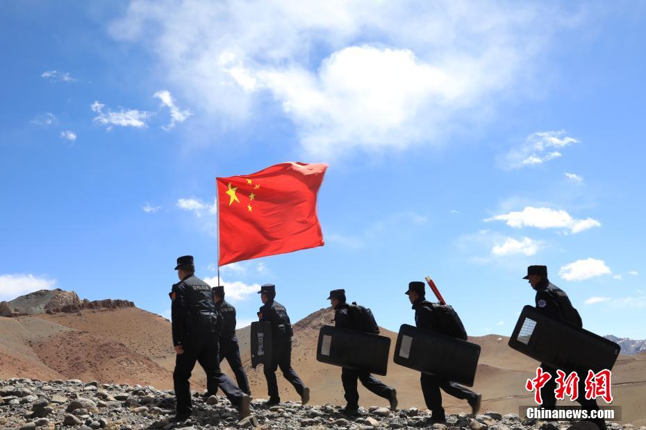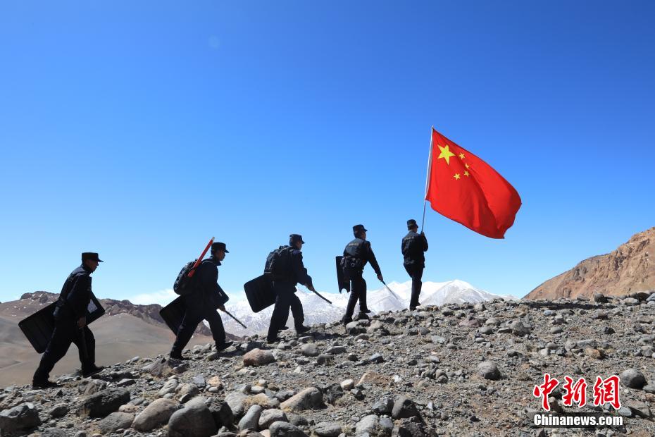 近日,西藏阿里邊境管理支隊扎西崗邊境派出所組織民警和護邊員通過乘車巡邏和徒步巡邏相結合的方式,前往海拔4800米的“守邊固邊第一村”——典角村古格川執勤點巡邏,經過一個小時的車巡和一個小時的徒步巡邏,民警到達了古格川執勤點。通過巡邏,及時掌握了邊境一線情況,確保了邊境轄區安全穩定。圖為民警與國旗合影。郭遠敬 攝
