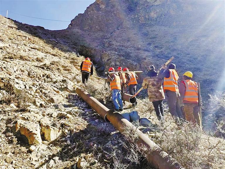 圖為中鐵二十一局工人在巴嘎雪片區將主鋼管轉運至焊接點位。 記者 楊小娟 攝
