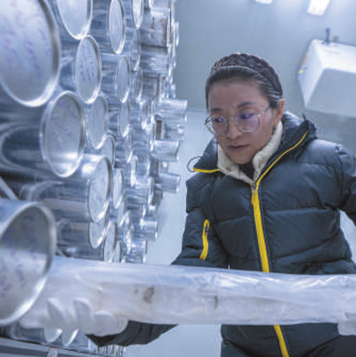 德吉至今還記得第一次和老師們見到冰芯的場景。那是她剛讀研究生的時候,跟著研究團隊到西北處理冰芯。在冷庫里,老師們小心翼翼地把圓柱形的冰芯從中間分開,切成兩半,并按規(guī)范進行分類和保存。德吉得知,這些樣本一半會在冷庫里保存,而另一半將會被用來開展成分分析,從中解讀其記錄的氣候變化。