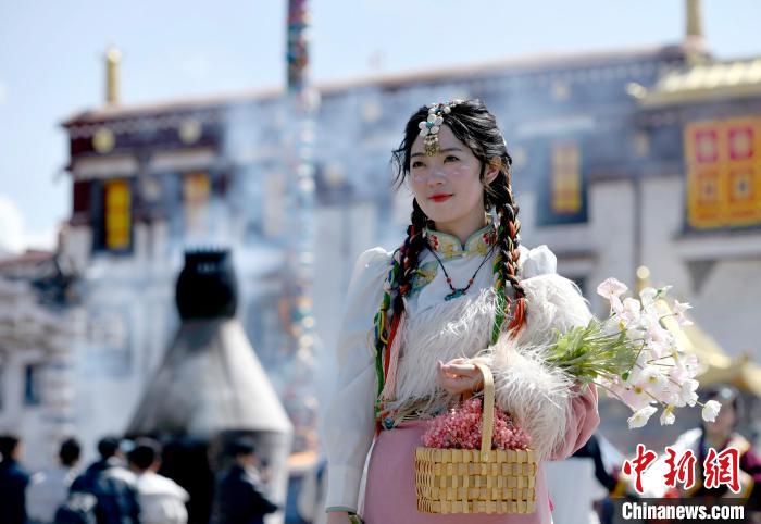 4月17日,游客身著藏式元素服裝在拉薩大昭寺廣場拍照留念。 李林 攝
