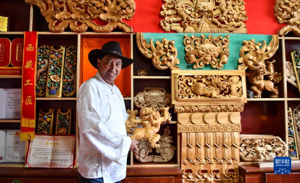 拉巴次仁展示他的木雕作品(4月25日攝)。新華社記者 晉美多吉 攝