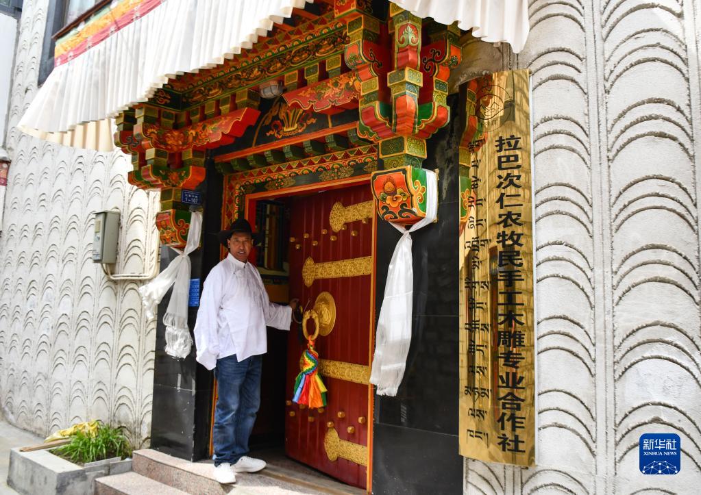 拉巴次仁在農牧民手工木雕專業合作社門前(4月25日攝)。新華社記者 晉美多吉 攝