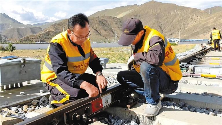 5月1日,2023年“西藏五一勞動獎章”獲得者劉祥斌(左)和同事在青藏鐵路拉薩工區巡檢鐵路。李洲 攝