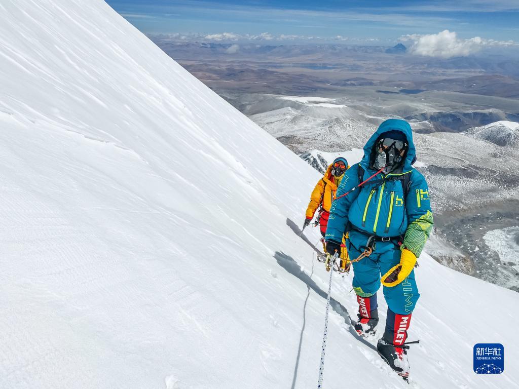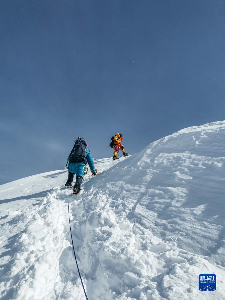 董紅娟(左)在登頂希夏邦馬峰后下撤(4月26日攝)。新華社發(頓巴 攝)