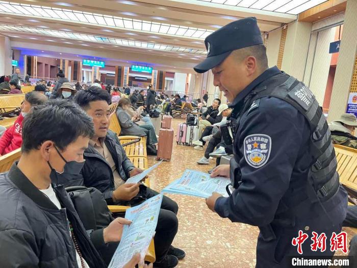 圖為拉薩鐵路公安民警為游客發放宣傳冊。 貢嘎來松 攝