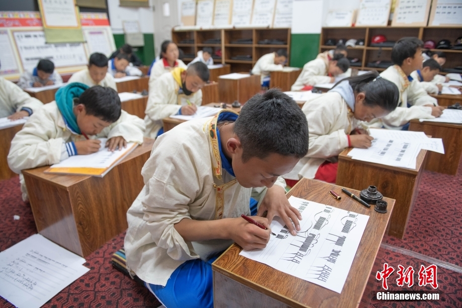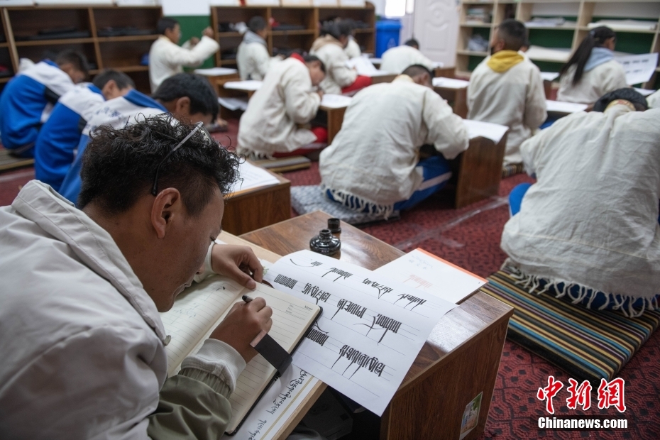 5月7日,西藏山南市,加查縣中學學生在上藏文書法興趣班。該興趣班由2名藏文教師任教,每周兩課時,利用自習課或晚自習時間為學生和教師授課。課程內容包含執筆、運筆、姿勢等基礎書寫技能,以及藏文中的烏金體、珠擦體、簇仁體、簇通體等各類字體的書寫方法。