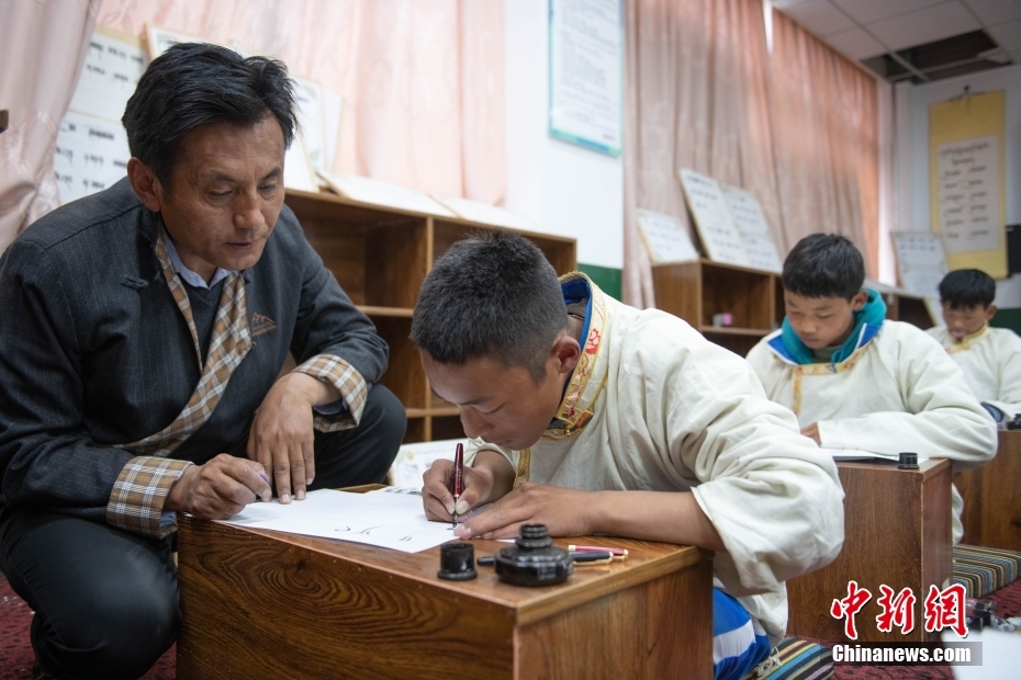 5月7日,西藏山南市,加查縣中學藏文書法興趣班的教師扎西達瓦給學生們上課。該興趣班由2名藏文教師任教,每周兩課時,利用自習課或晚自習時間為學生和教師授課。課程內容包含執筆、運筆、姿勢等基礎書寫技能,以及藏文中的烏金體、珠擦體、簇仁體、簇通體等各類字體的書寫方法。