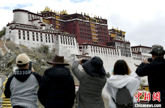 5月19日,游客在西藏拉薩布達拉宮觀景臺拍照留念。5月的拉薩初夏,草木漸茂、綠樹成蔭,雨量充沛、濕度適宜,日光充盈卻少了一絲燥熱,成為了眾多游客選擇進藏的最佳時節。 中新社記者 李林 攝