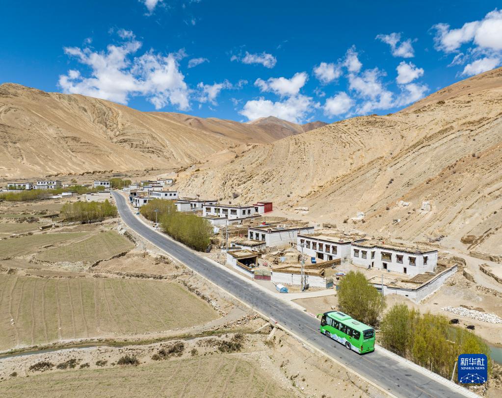 一輛載有游客的環保大巴車正駛向珠峰(5月25日攝,無人機照片)。新華社記者 孫非 攝