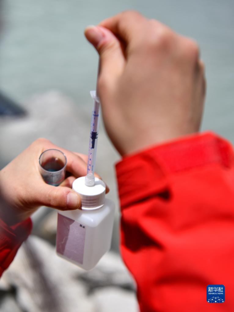 在珠峰登山大本營附近,來自中國科學院青藏高原研究所的科考隊員邱海英在檢測絨布冰川末端水質(5月14日攝)。新華社記者 孫非 攝