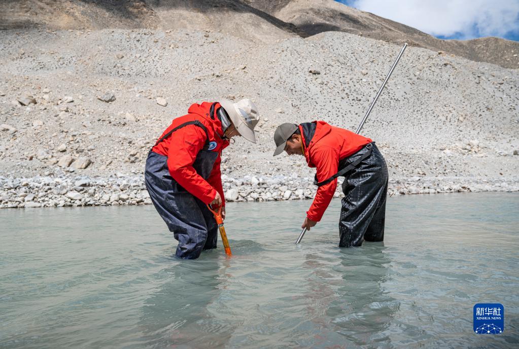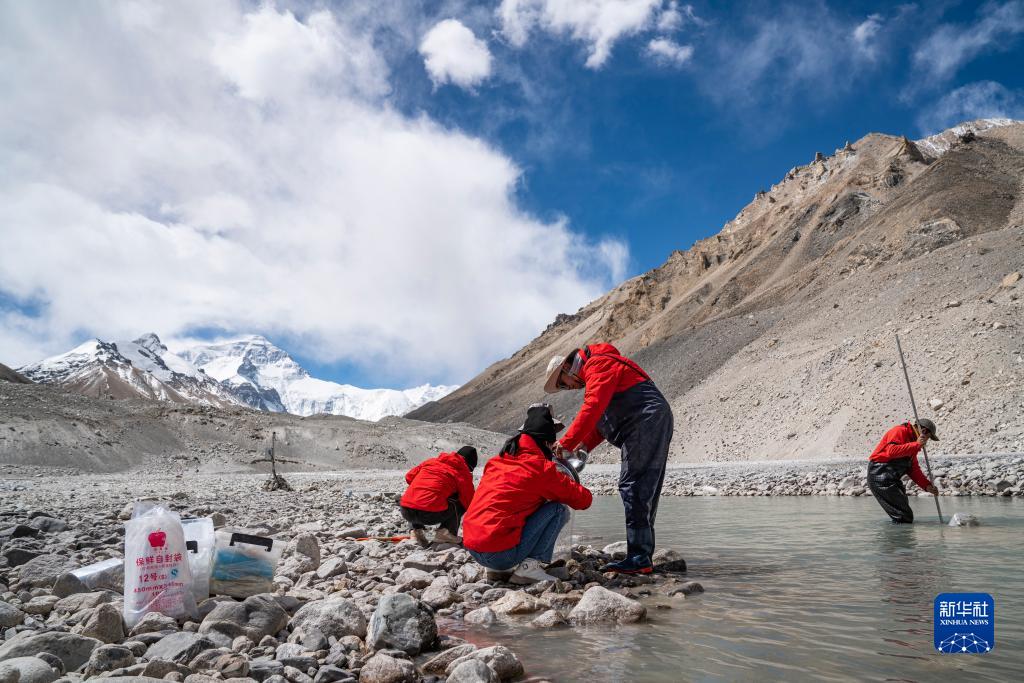在珠峰登山大本營附近,來自西藏大學生態環境學院的科考隊員在進行水生態調查(5月22日攝)。新華社記者 孫非 攝