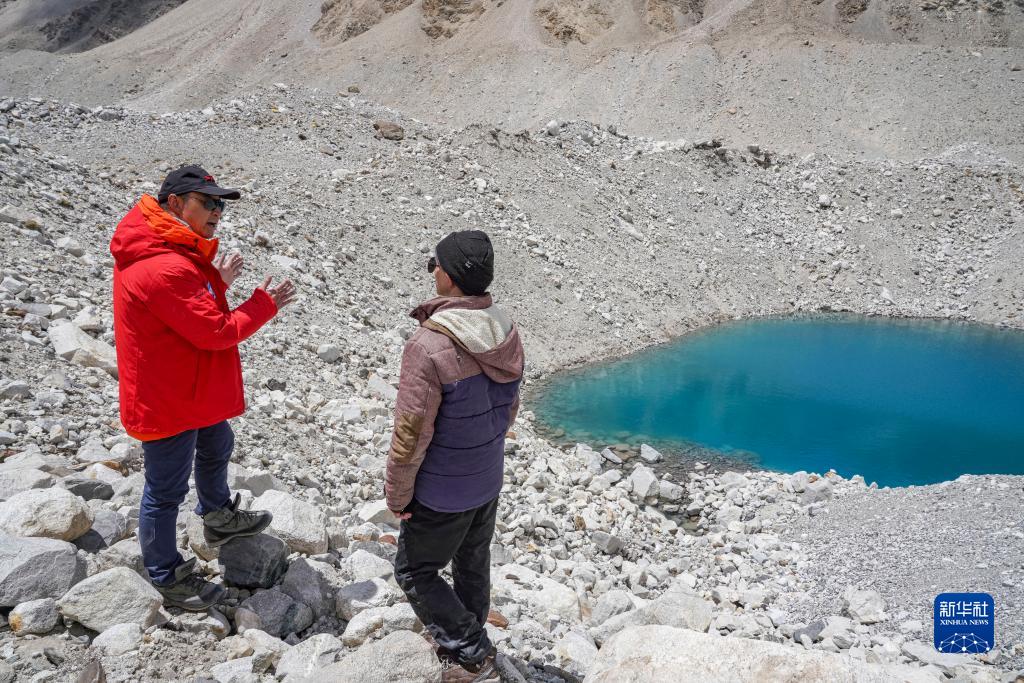 在珠峰海拔約5300米處,中國科學院西北生態環境資源研究院副院長康世昌(左)和科考隊員討論冰面湖的形成原因(5月14日攝)。新華社記者 孫非 攝