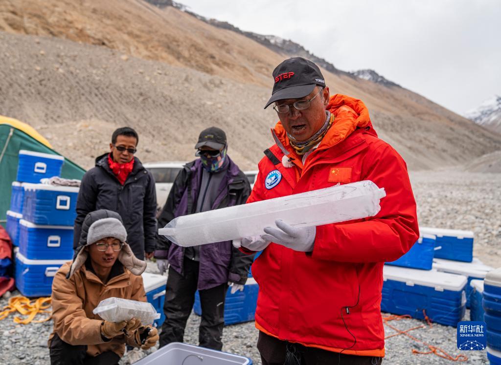 在珠峰登山大本營,中國科學院西北生態環境資源研究院副院長康世昌(右)在查看從珠峰海拔約6500米處鉆取的冰芯樣品(5月22日攝)。新華社記者 孫非 攝