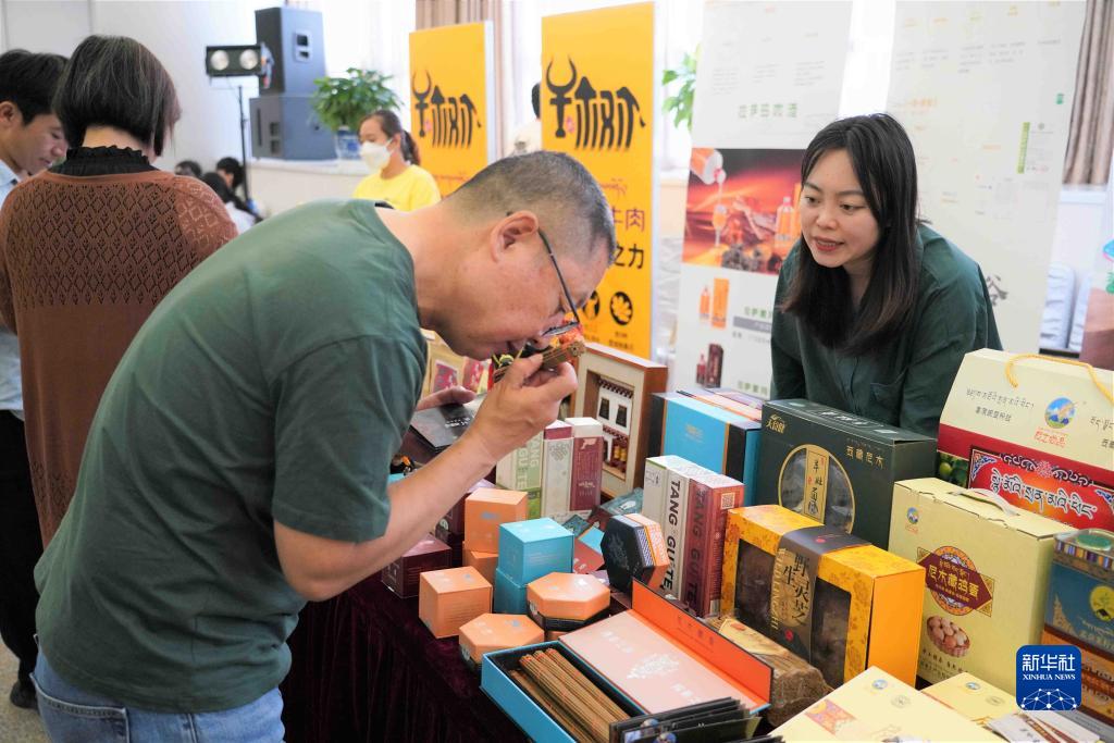 5月26日,推介會現場的工作人員為參觀者介紹西藏特色產品。新華社發(王靜頤攝)