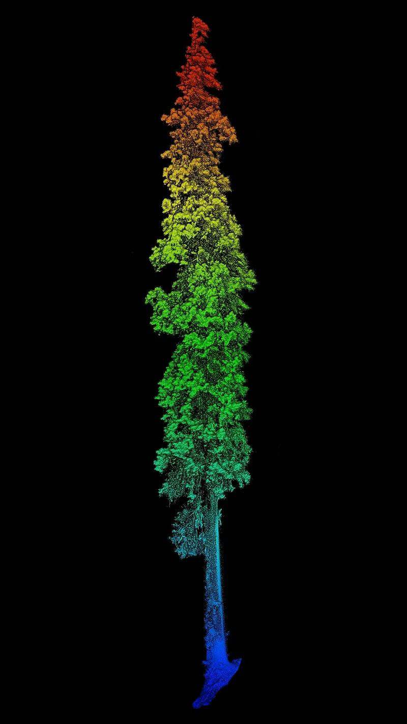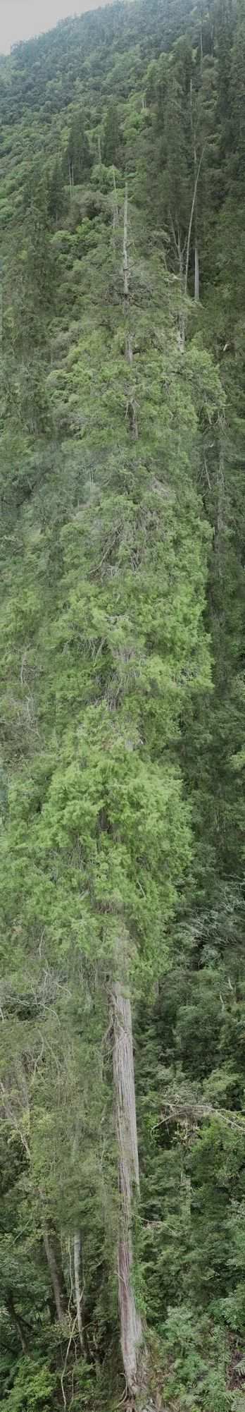 通過無人機與背包激光雷達相結合,對西藏柏木巨樹聚生區域進行精準測量,得到了巨樹群的精準三維點云模型。經過高度測量,發現其中一棵西藏柏木高達102.3米,該發現同時刷新了中國與亞洲的最高樹紀錄,躋身按樹種排名的世界最高樹列表,位列第二。研究團隊獲取了該樹的精細三維點云數據,測量其胸徑為293厘米,并采用無人機攝影的方式獲取了巨樹等身照。