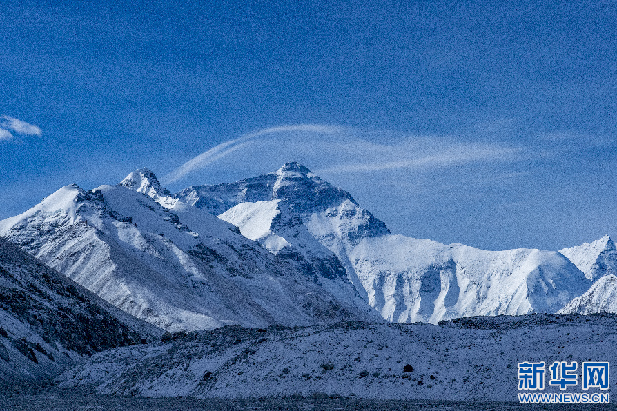 從珠穆朗瑪峰登山大本營拍攝的珠穆朗瑪峰。 新華網 旦增努布 攝