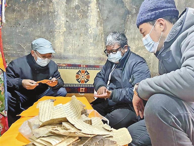 扎西頓珠陪同自治區圖書館古籍保護中心專家在林周縣普查藏文古籍。