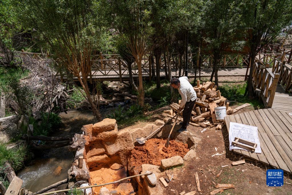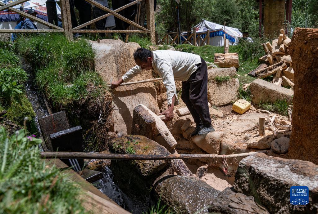 在西藏尼木縣吞巴鎮吞達村,次仁多吉在啟動水磨,將作為原料的柏木碾成木漿(6月9日攝)。新華社記者 孫非 攝