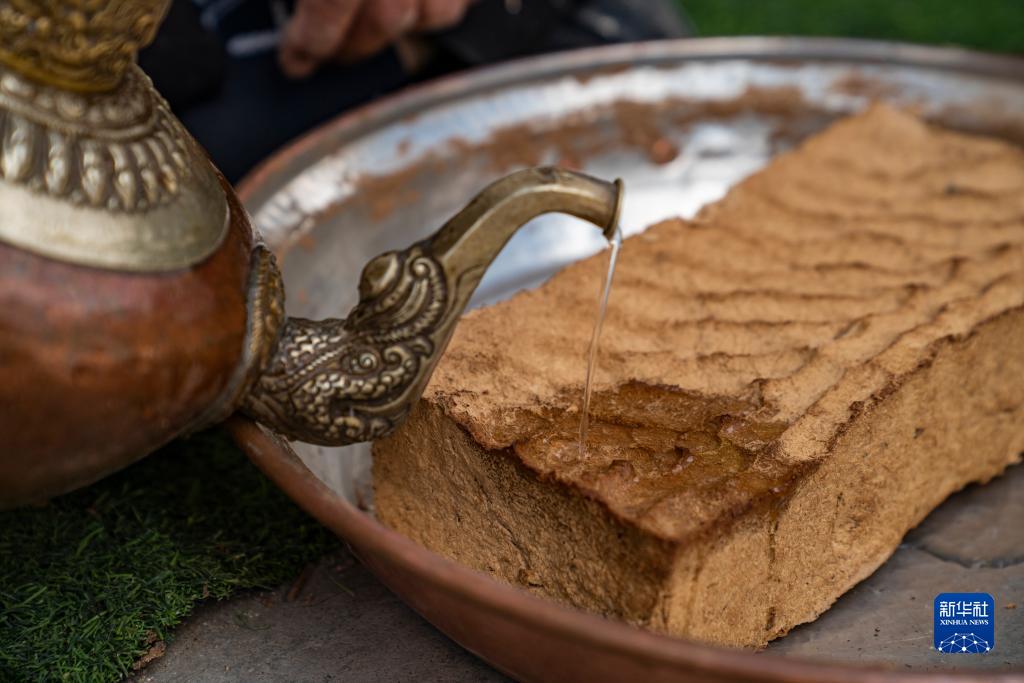 在西藏尼木縣吞巴鎮吞達村,次仁多吉用水浸潤晾曬后的香磚(6月9日攝)。新華社記者 孫非 攝