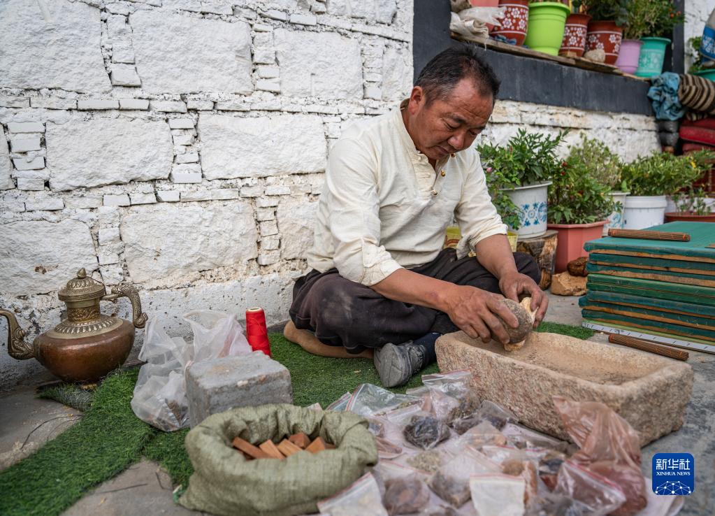 在西藏尼木縣吞巴鎮吞達村,次仁多吉在研磨藥材和香料(6月9日攝)。新華社記者 孫非 攝