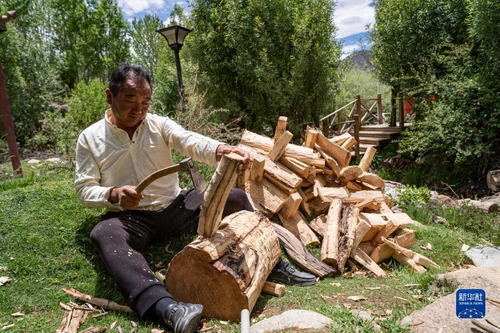 在西藏尼木縣吞巴鎮吞達村,次仁多吉在砍削柏木,為藏香制作準備原料(6月9日攝)。新華社記者 孫非 攝