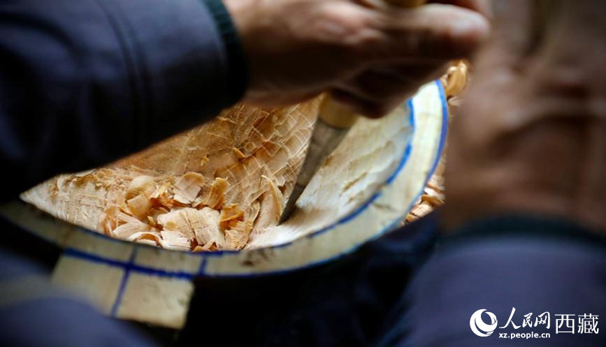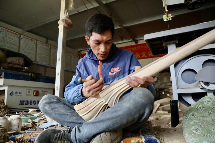 傳承人羅布次旦檢查琴體打磨后的樣板。人民網(wǎng)記者 次仁羅布攝