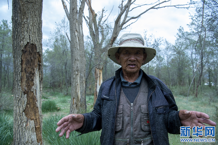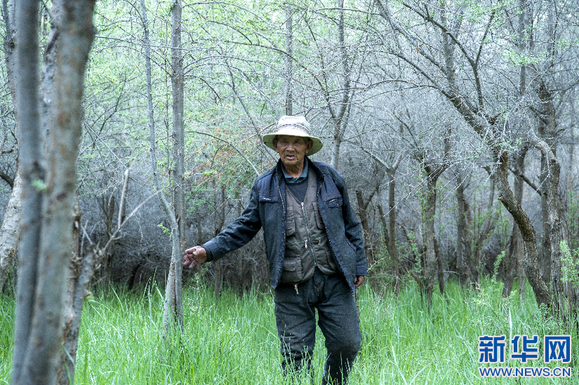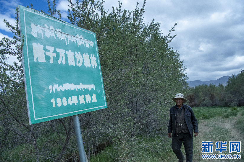 6月8日,索朗拉杰在介紹當年試種沙棘、楊樹、榆樹等的情況。新華網 旦增努布 攝